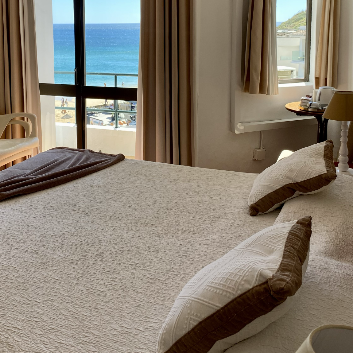 O Quarto Duplo Standard oferece um ambiente acolhedor e funcional, com vista mar, ideal para quem procura conforto e tranquilidade junto à praia.